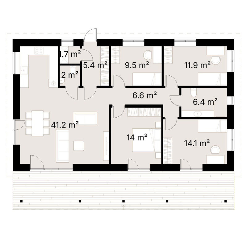 Der 41,2 m² große offene Wohn- und Essbereich ist das Herzstück des Hauses. Große Fenster durchfluten den Raum mit natürlichem Licht und bieten einen Blick auf die umliegende Landschaft. Die Küche fügt sich nahtlos in den Wohnbereich ein und bietet den perfekten Rahmen für Familienfeiern.