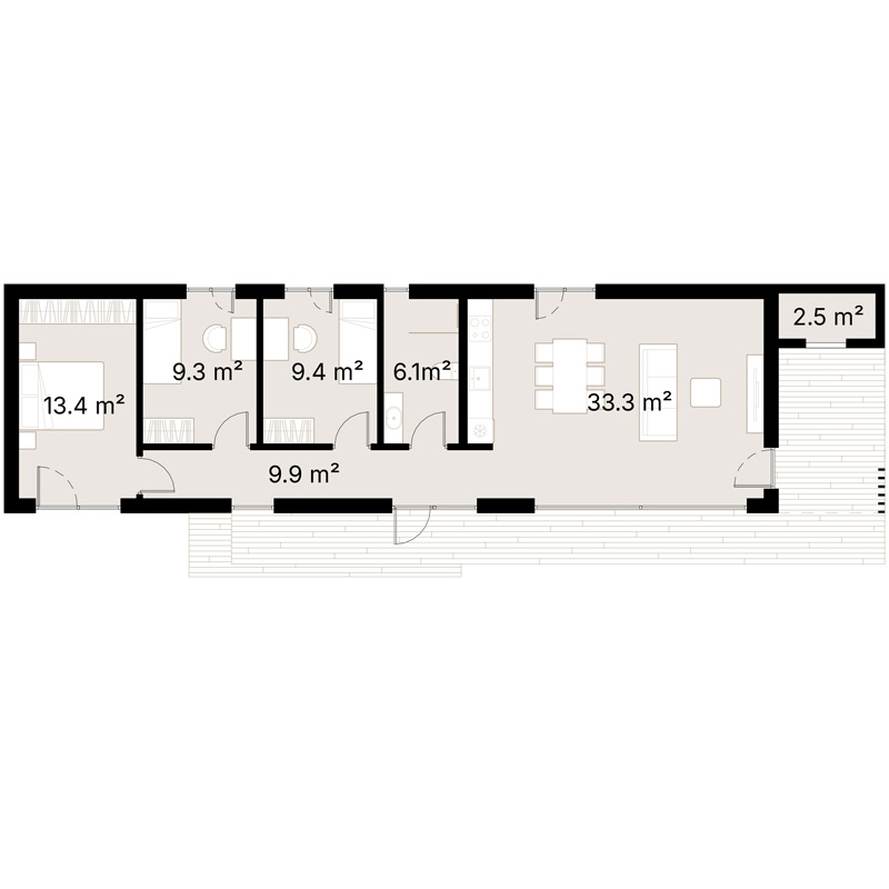 Das 33,3 m² große Wohnzimmer ist das Herzstück des Hauses und verfügt über große Fenster, durch die natürliches Licht in den Raum fällt und einen nahtlosen Übergang nach draußen schafft. Die integrierte Küche unterstreicht das offene Layout und eignet sich perfekt für den täglichen Gebrauch und informelle Zusammenkünfte.