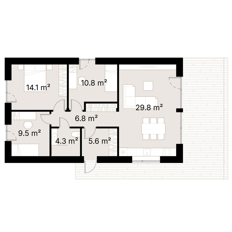 Das 29,8 m² große Wohnzimmer ist der Mittelpunkt des Ferienhauses und verfügt über große Fenster, die viel natürliches Licht hereinlassen und eine Verbindung nach draußen herstellen. Die angrenzende Küche ist effizient gestaltet, sodass die Zubereitung von Mahlzeiten und das Essen angenehm und bequem sind.