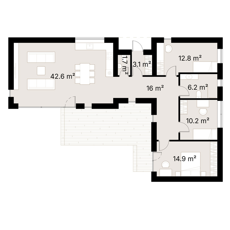 Das Hauptschlafzimmer bietet einen geräumigen Rückzugsort von 14,9 m², während die beiden zusätzlichen Schlafzimmer vielseitigen Platz für Kinder, Gäste oder ein Heimbüro bieten.