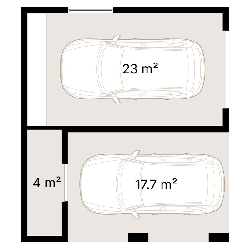 Diese Doppelgarage bietet ein einzigartiges Design mit einem 17,7 m² großen Carport für ein Fahrzeug und einer zusätzlichen 23 m² großen geschlossenen Garage für ein weiteres Auto oder einen geräumigen Lager- oder Arbeitsraum. Das Design umfasst einen separaten 4 m² großen Lagerraum, der sich ideal für Werkzeuge oder Gartengeräte eignet und zusätzliche Flexibilität und Funktionalität bietet.