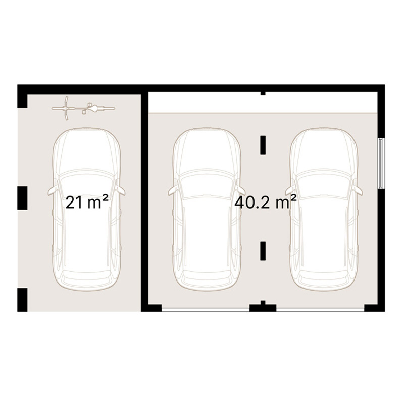 Diese Kombination aus einem 21 m² großen Carport und einer größeren, 40,2 m² großen, geschlossenen Doppelgarage bietet das Beste aus beiden Welten. Diese Aufteilung ist äußerst funktional und ideal für Haushalte mit mehreren Fahrzeugen oder für Haushalte, die zusätzlichen Platz für Lager- oder Arbeitsräume benötigen.