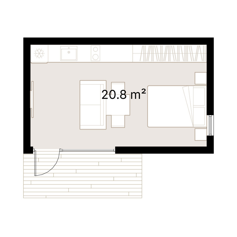 Genießen Sie den großzügigen Raum in diesem 20,8 m² großen Gartenhaus, das viel Platz für verschiedene Nutzungen bietet. Das Panoramafenster durchflutet den Raum mit natürlichem Licht und schafft eine einladende Atmosphäre für eine Reihe von Aktivitäten.